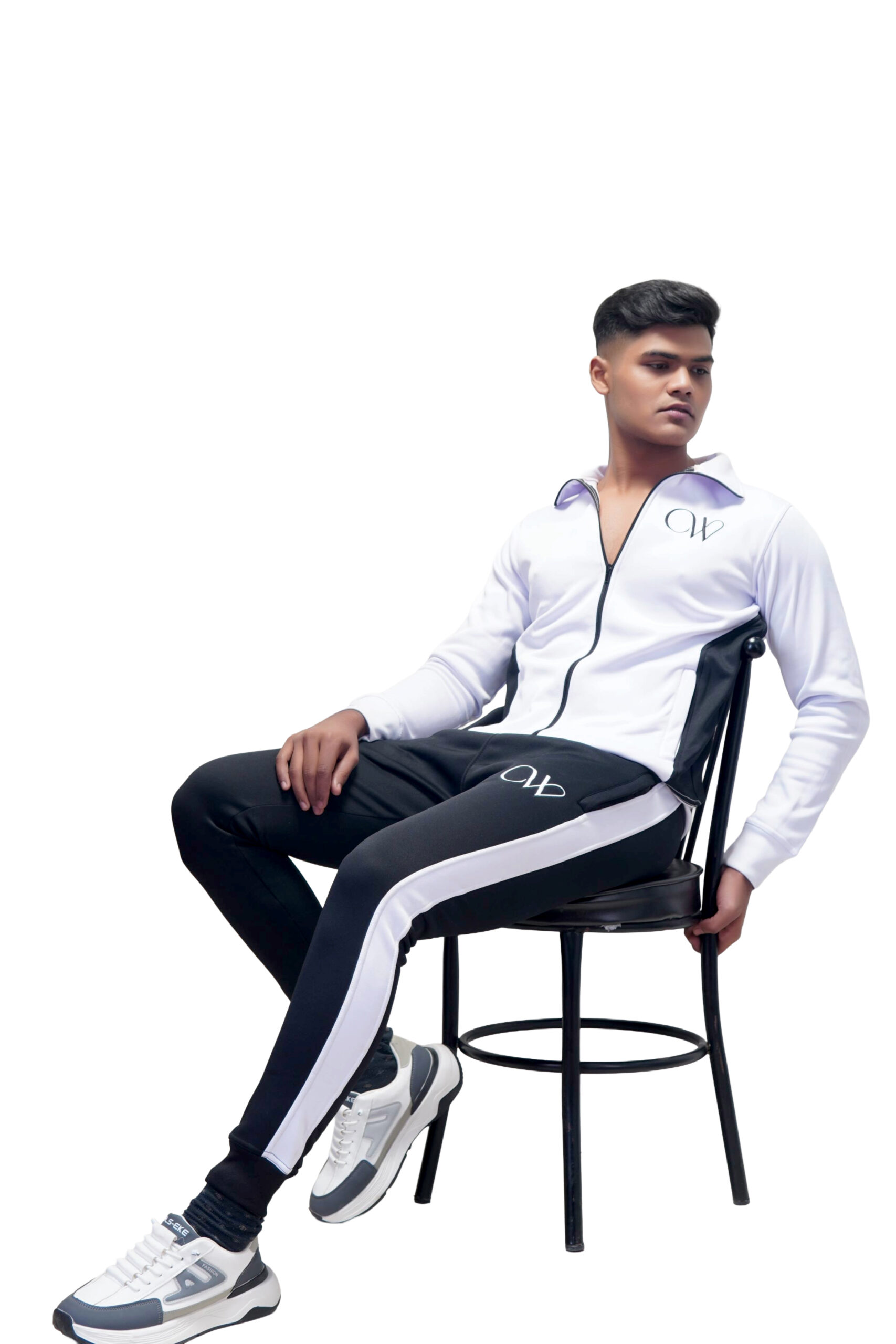 Dynamic Contrast: Bright White jacket with bold Black panels and Black pants with a White side stripe.